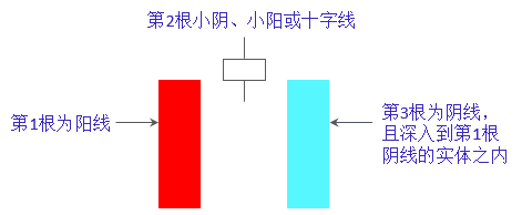 黄昏之星也是由3根K线组成,其形成和黎明之星形态刚好相反。黄昏之星的第1根是阳线,第2根是小阴、小阳或十字线,第3根是阴线,且阴线实体深入到第1根阳线实体之内。