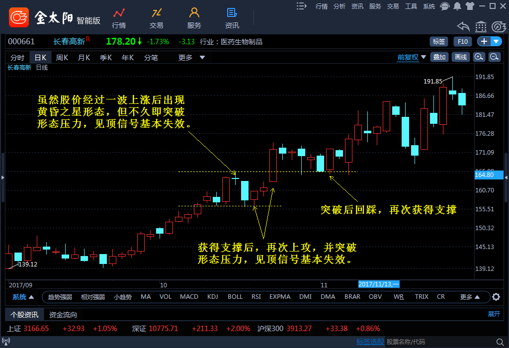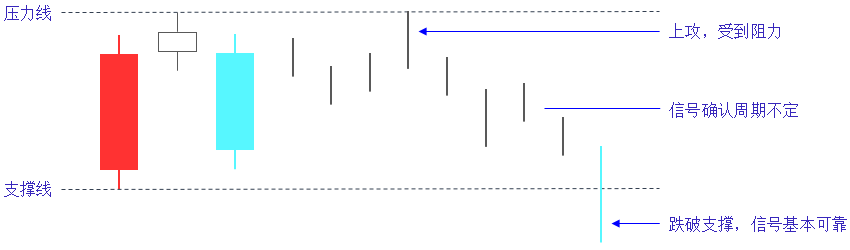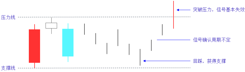 一般情况下,黄昏之星以3根K线的最高价和最低价作为压力和支撑,再结合股价的整体走势来判断信号的可靠性。跌破支撑,则认为信号基本可靠;突破压力,则认为信号基本失效。