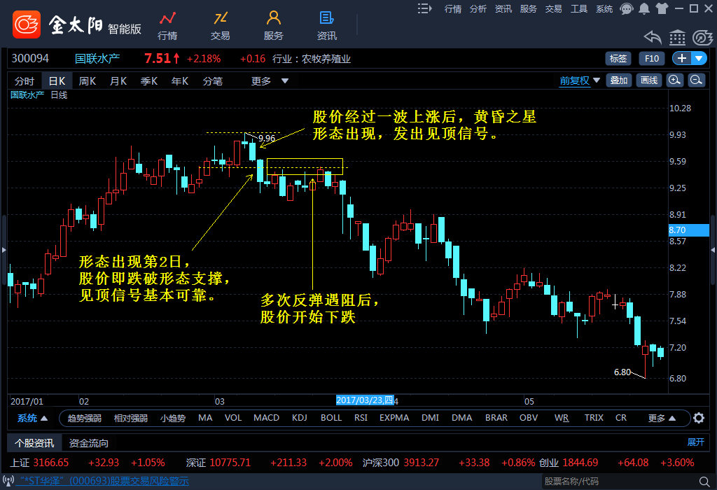 一般情况下,黄昏之星的走势意味着上涨行情的结束,其第1根阳线,承接前期的涨势,第2根小蜡烛线,表现出多方力量趋弱,而第3根阴线的出现,往往预示着下跌行情的开始。当第3根阴线深入到第1根阳线实体一半以上,甚至完全吞没阳线时,说明空方的实力更为强劲,此时的黄昏之星所发出的信号也更为强烈。