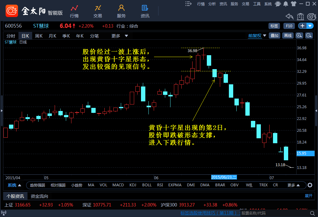 一般情况下,前期涨幅越大,第3与第1根K线的反转比例越明显,或者形态构成期间伴有放量现象,则形态所发出的信号可靠性越高。当第2根K线为十字星时,又叫黄昏十字星,其信号要强于一般的黄昏之星形态。