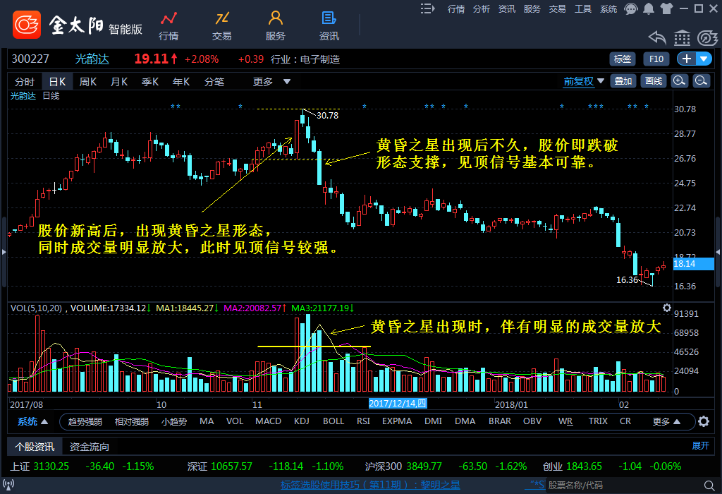 黄昏之星是黎明之星的反向形态,是一种可靠性较高的见顶形态,当股票经过一波上涨后出现此形态,需要引起重视,如果股价跌破形态支撑,不妨离场观望,关注股价后续走势。