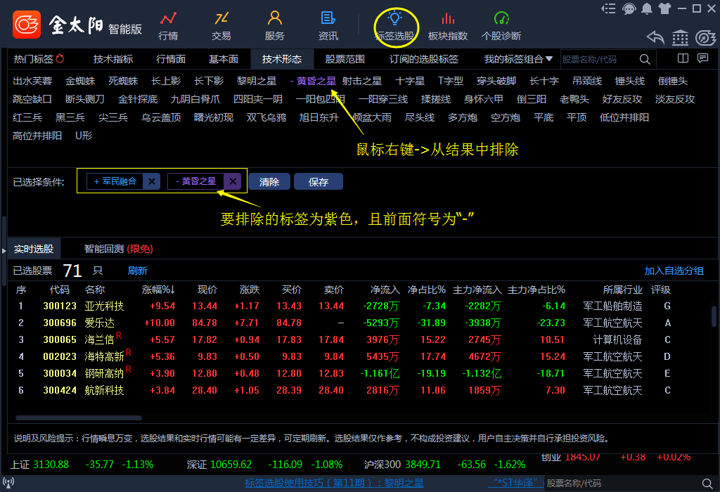对于这种见顶形态,我们在选股时一般使用排除操作,在选择好您钟意的标签或标签组合后,使用鼠标右键点击“黄昏之星”,选择“从结果中排除”即可。